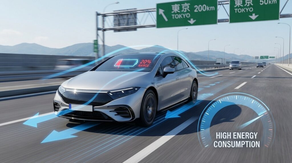 - モーターの高回転維持:変速機(トランスミッション)を持たない多くのEVは、速度が上がるとモーターの回転数も上がり続け、電力消費効率が悪い領域に入ってしまうことがあります。